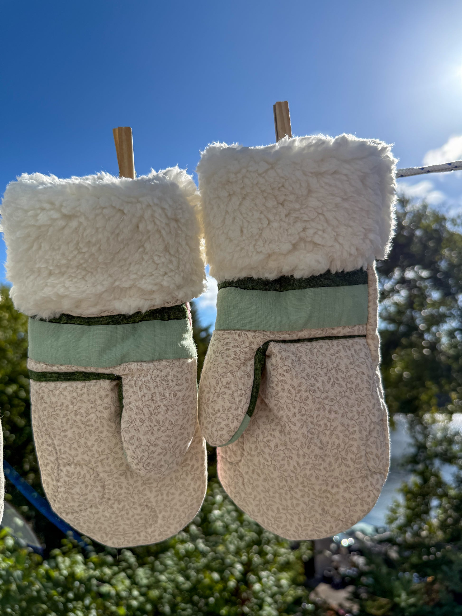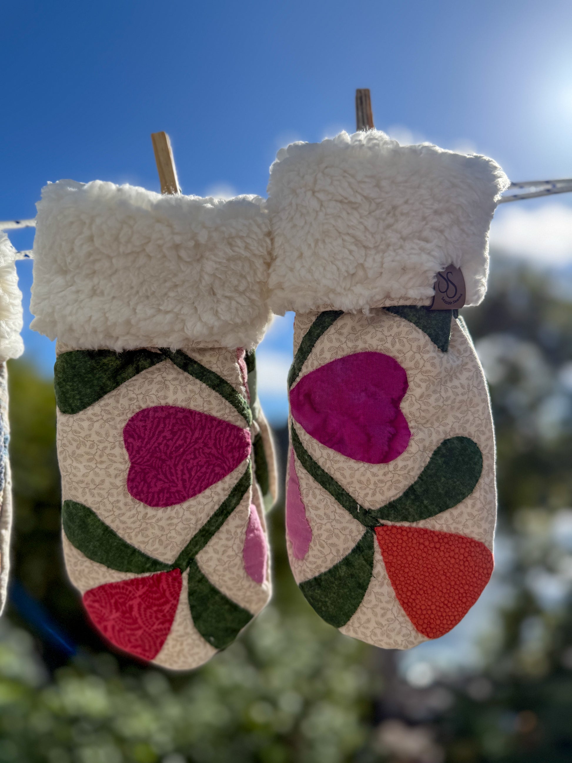 Embrace the chill in style with our Quilted Mittens, thoughtfully crafted from upcycled quilt coat remnants and fully lined with ultra-plush sherpa for unmatched warmth and comfort. These mittens are a testament to our commitment to sustainability, ensuring that no fabric goes to waste.