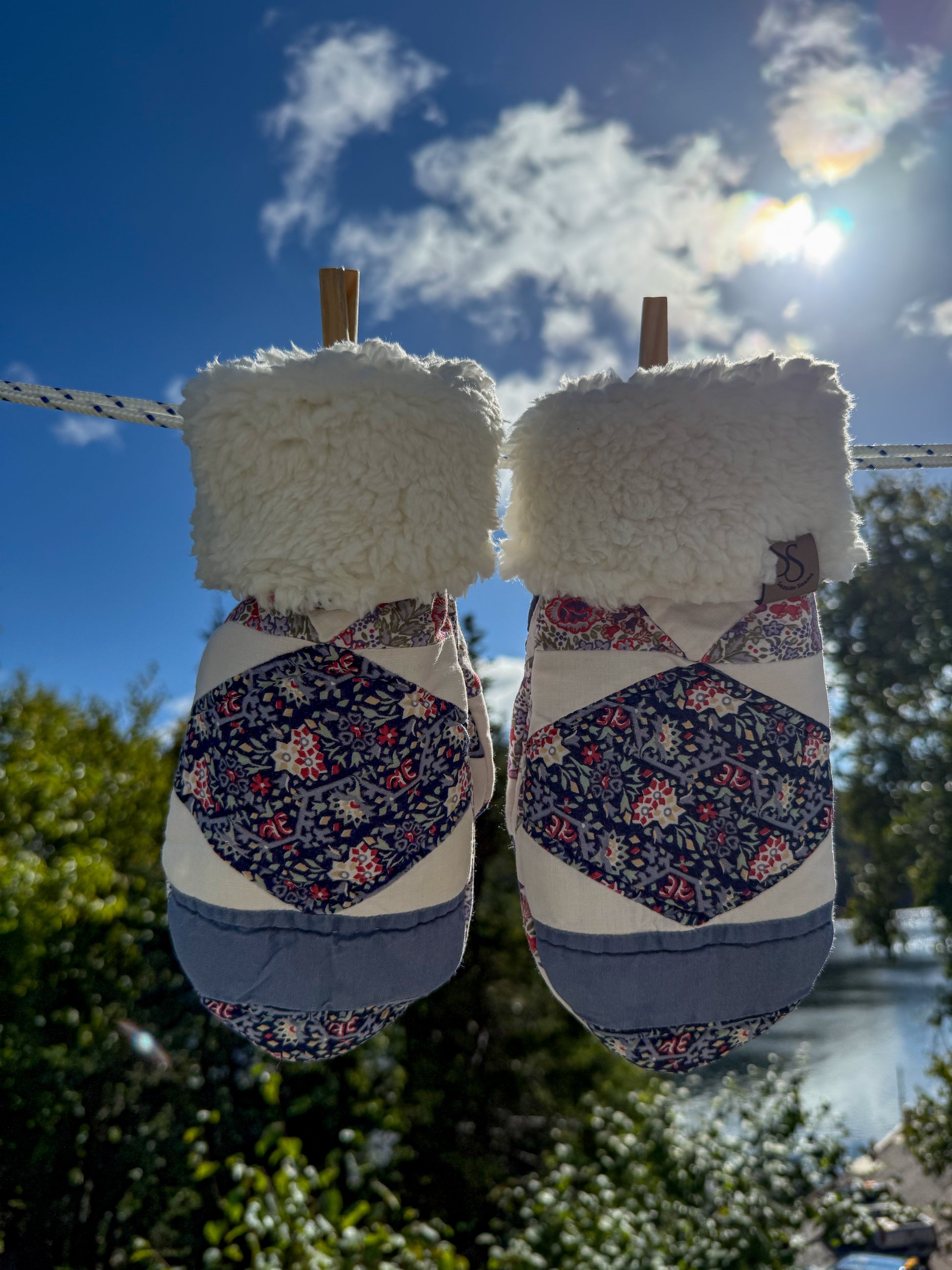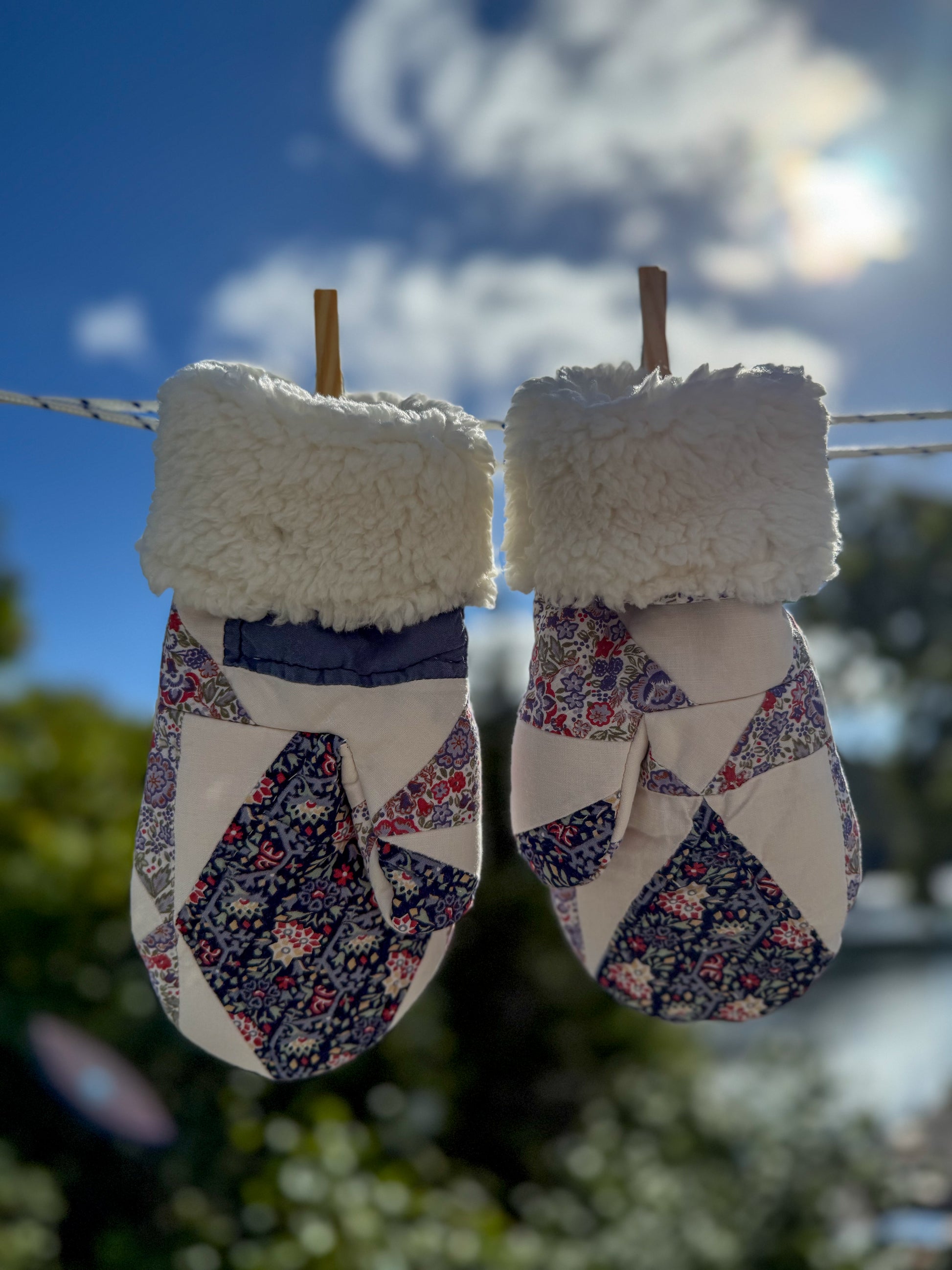 Embrace the chill in style with our Quilted Mittens, thoughtfully crafted from upcycled quilt coat remnants and fully lined with ultra-plush sherpa for unmatched warmth and comfort. These mittens are a testament to our commitment to sustainability, ensuring that no fabric goes to waste.