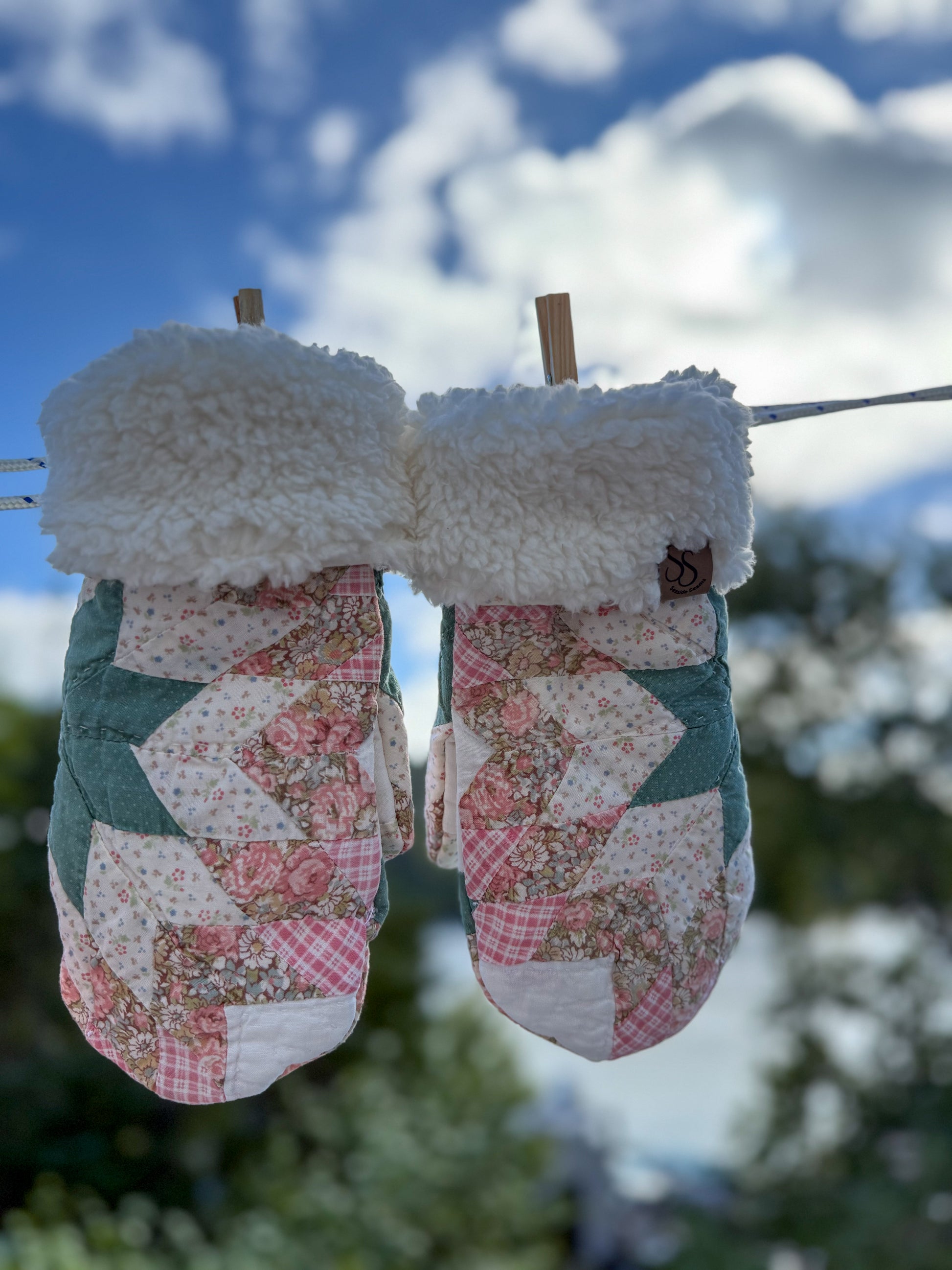 Embrace the chill in style with our Quilted Mittens, thoughtfully crafted from upcycled quilt coat remnants and fully lined with ultra-plush sherpa for unmatched warmth and comfort. These mittens are a testament to our commitment to sustainability, ensuring that no fabric goes to waste.