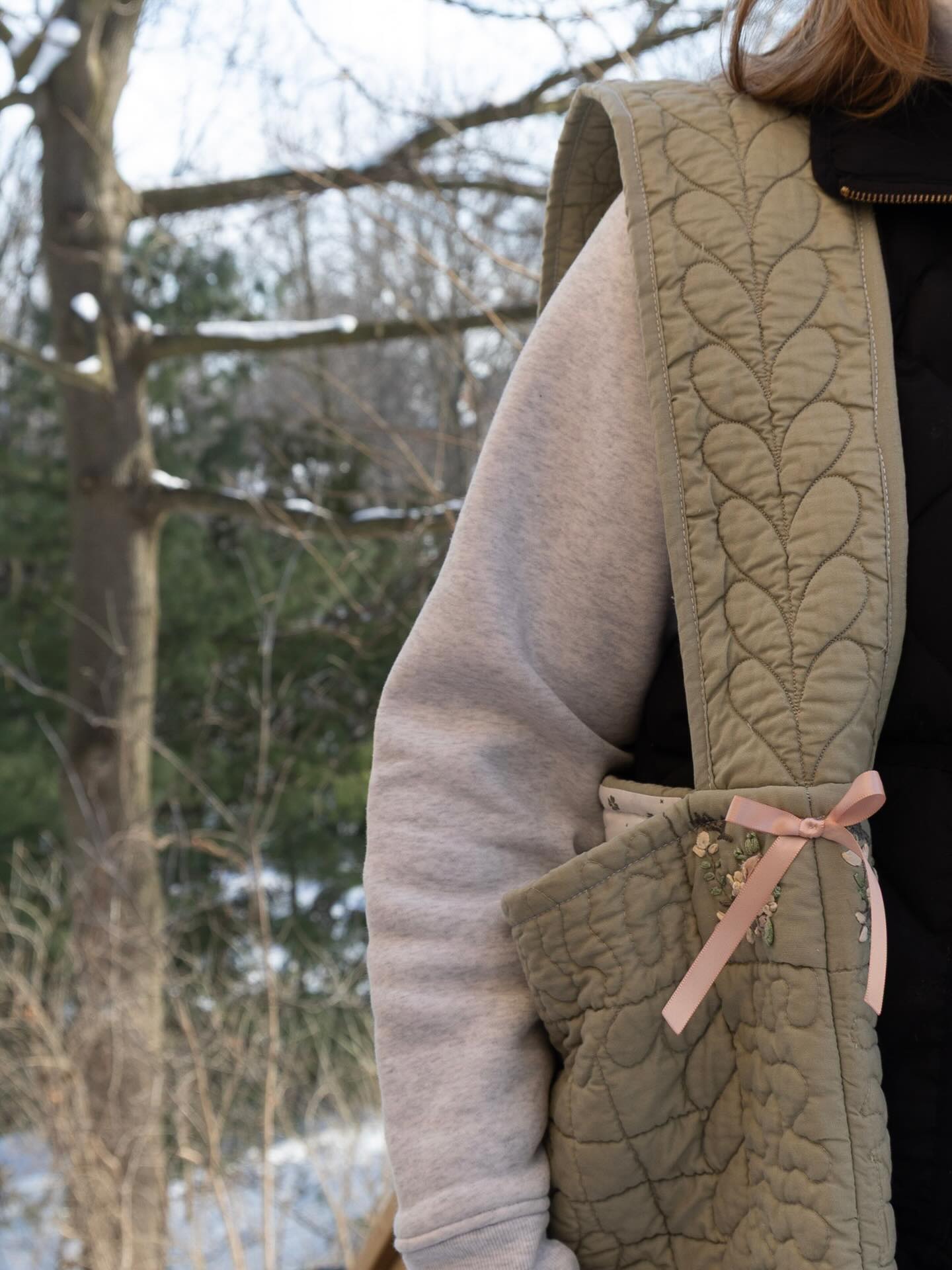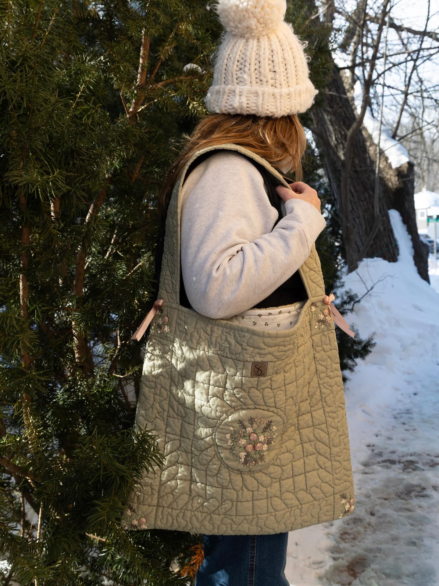The Meadow Bloom Tote is a celebration of vintage textiles and thoughtful details. Made from an upcycled quilt adorned with delicate embroidered florals and bow accents, this tote brings new life to a beautifully worn piece of the past.